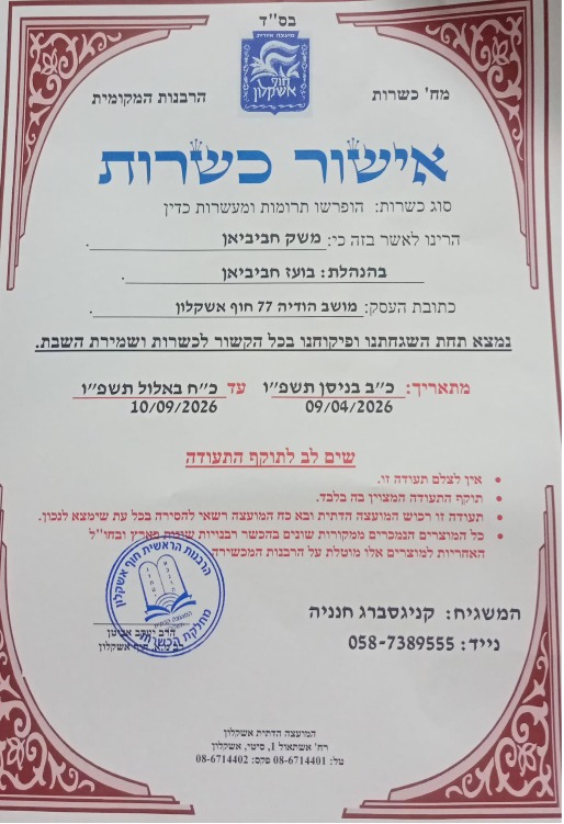 אנחנו כשרים תחת השגחה של הרבנות הראשית חוף אשקלון המשגיח שלנו הוא רבה הראשי של המועצה- הרב יעקוב אביטן. אנחנו מפרישים תרומות ומעשרות מידי יום ובשנת השמיטה פעלנו תחת היתר מכירה.